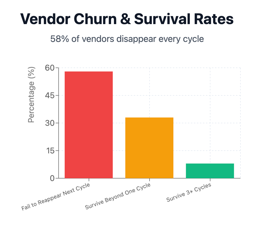 Other than getting into digital or fundraising, what other factors determine your future in this business? Digital specialization without committee ties: 6X higher failure probability. Single-client dependency: 28% of vendors derive >70% revenue from one source. Three unconnected anchor clients will double your survival probability.