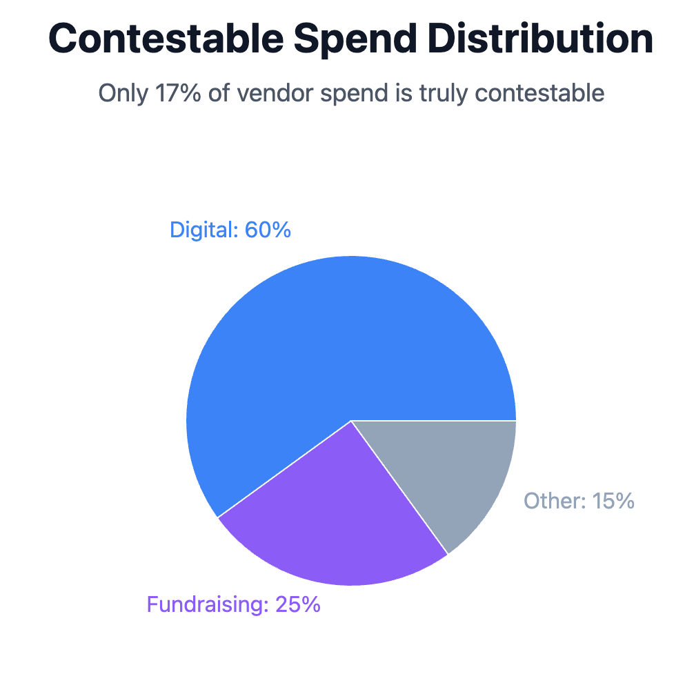 So where is the loose money? Digital covers 60% of contestable spending, and fundraising operations: 25% of contestable spending. In other words, virtually all of the non-renewal business goes to digital and fundraising. Unless you are inheriting the business, it’s ugly out there.