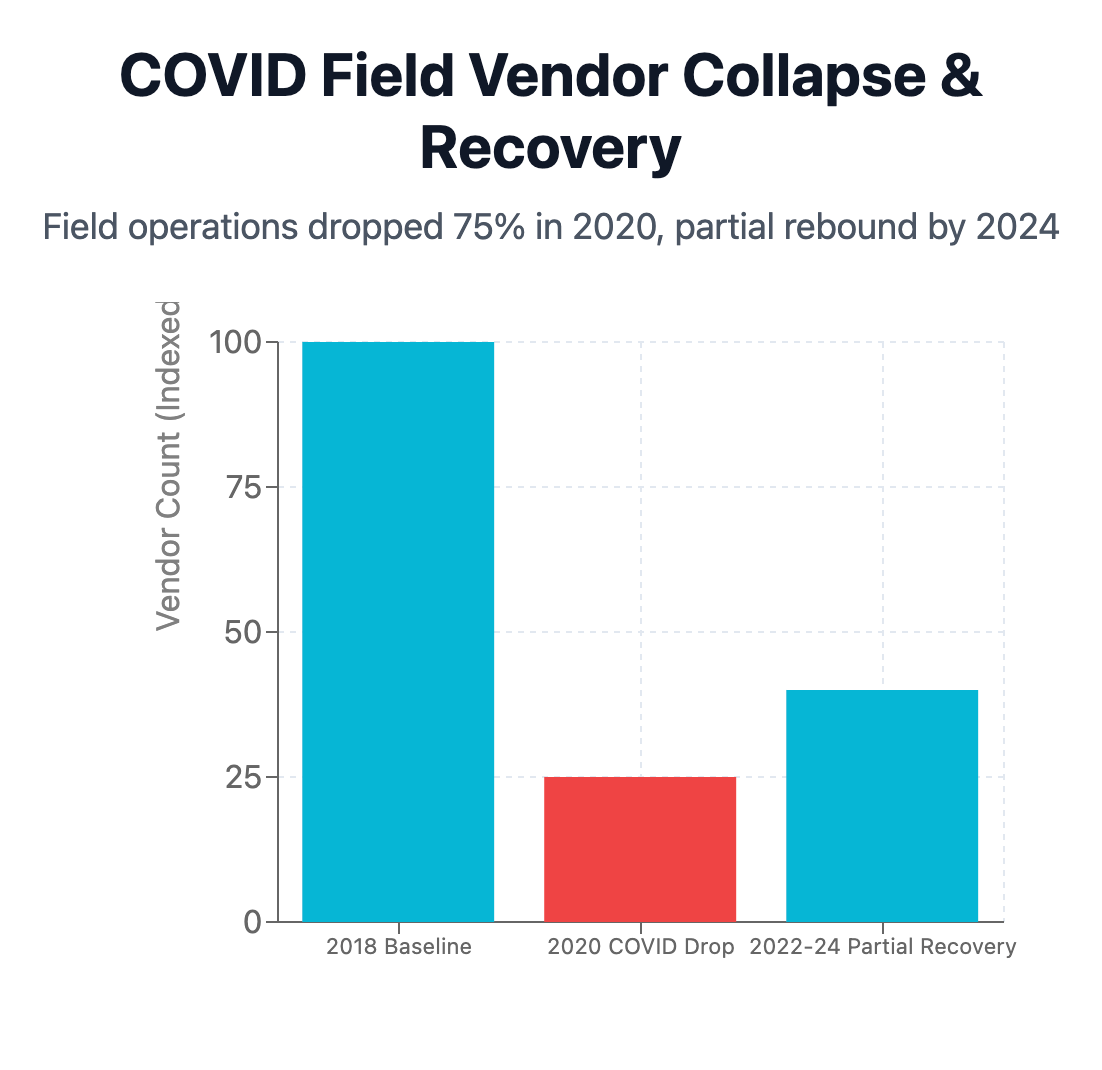 That extinction event was not a standalone. COVID didn’t permanently kill canvassing, but it did create a real extinction-like shock. Field vendor counts and dollars cratered in 2020, with only a fraction of pre-2019 activity showing up in the reports. By 2022–2024, door-to-door programs rebounded, but they won’t be the same… sort of the same way that prime office space on 16th and K Streets just feels different. The next extinction event will be AI-driven. If a robot can replace you, it will. That includes large swaths of our vertical, especially button-pusher media buyers.